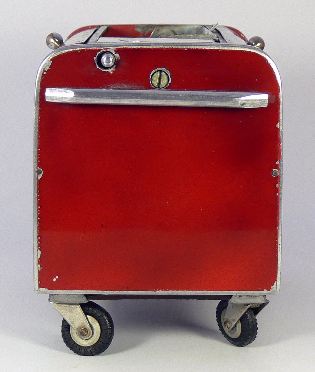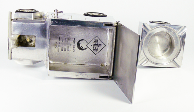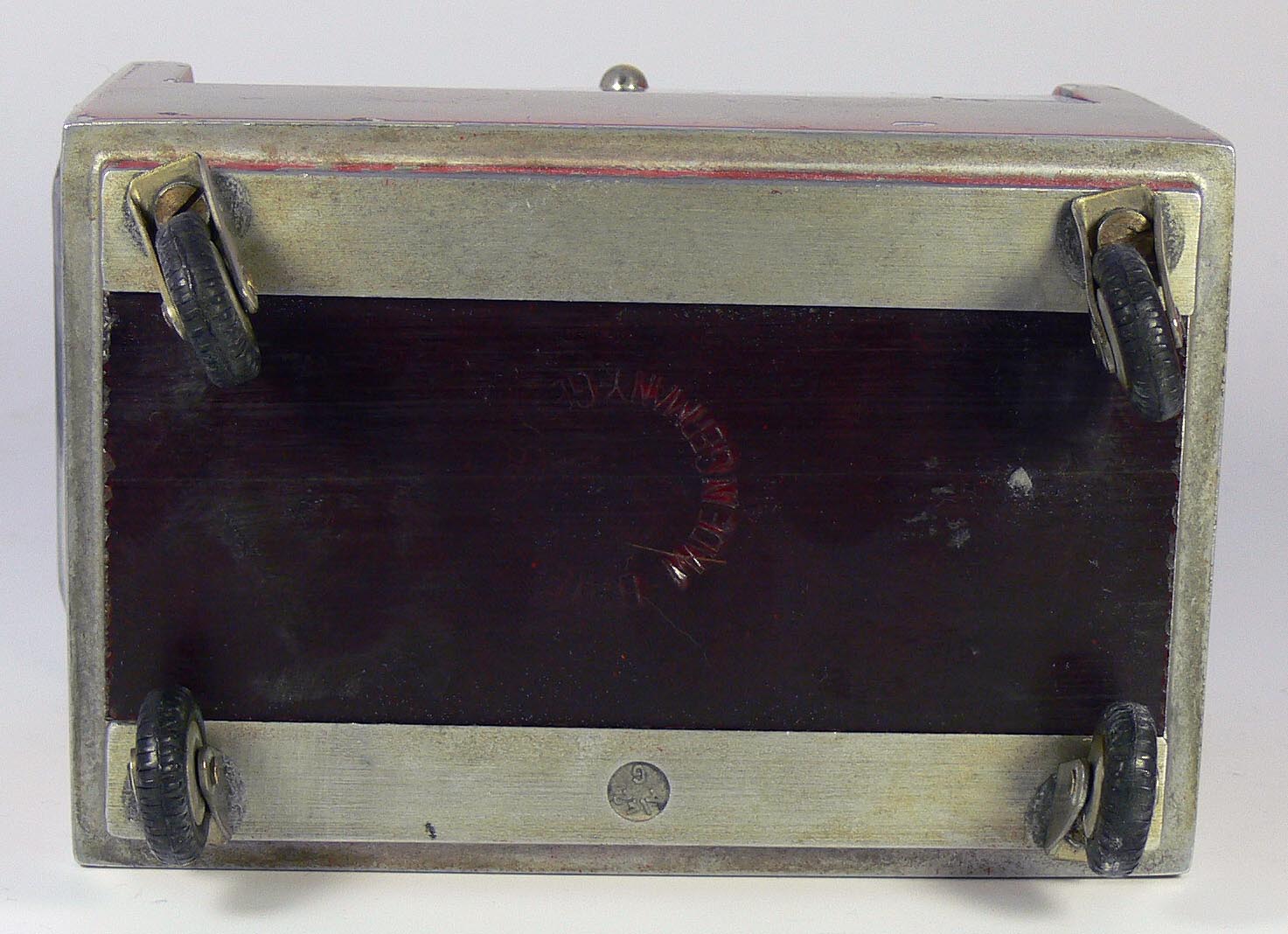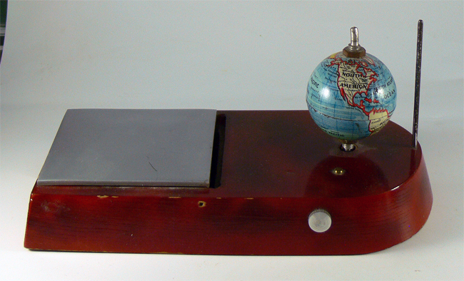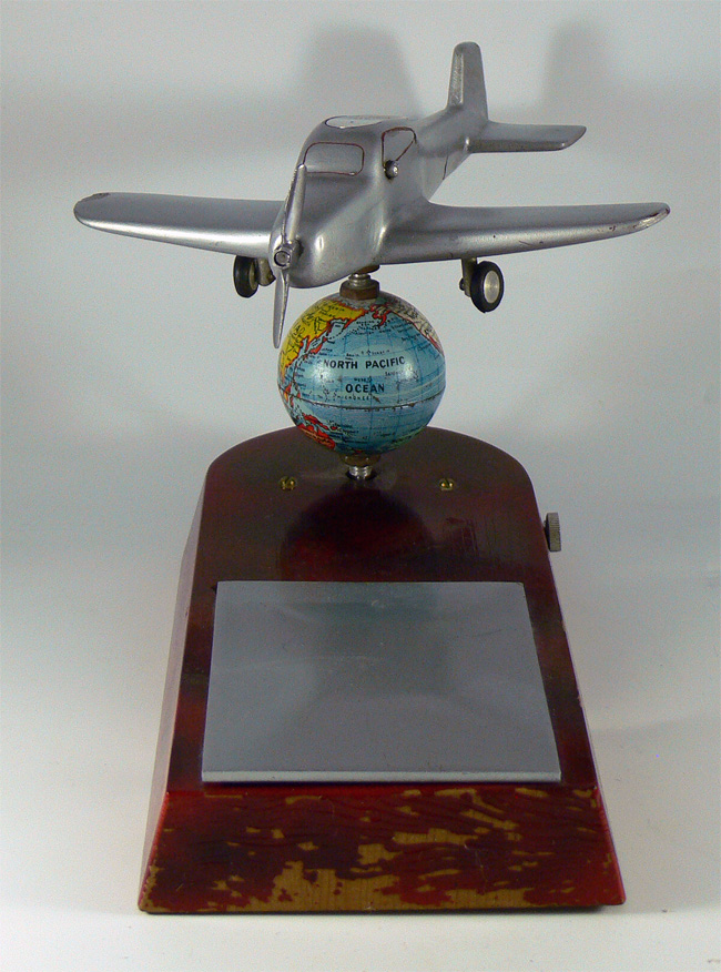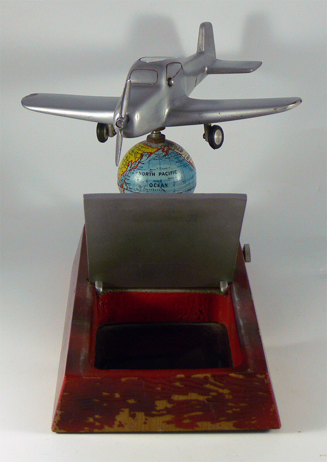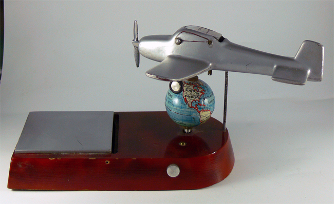 Unter der Klappe befindet sich ein Zigarettenfach; Unterhalb der Weltkugel befindet sich eine Spieluhr (in meinem Fall die Melodie "Lili Marleen") und die Weltkugel dreht sich dabei; der hintere Stahlstift dient dazu, dass sich das Flugzeug nicht mitdreht; das Feuerzeug befindet sich im Cockpit.