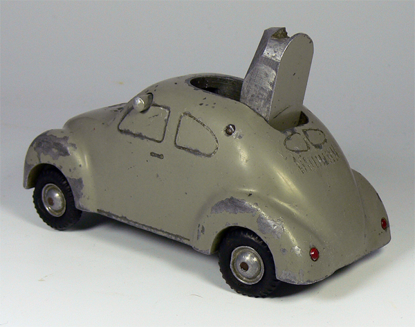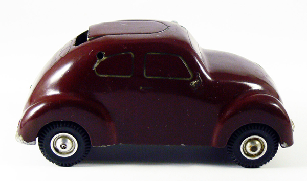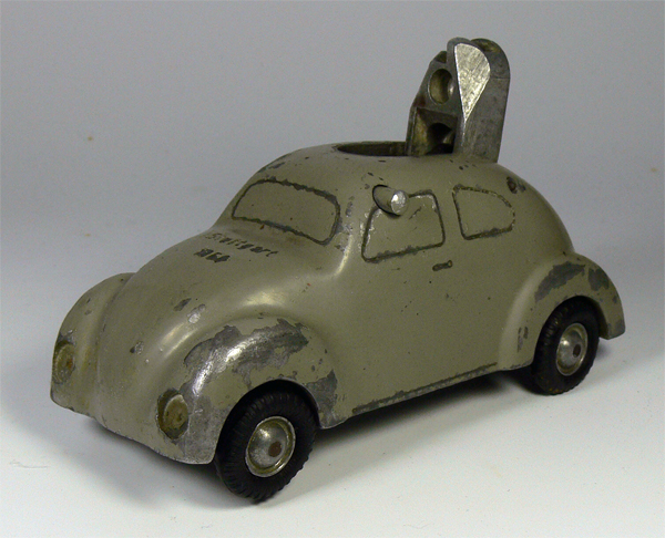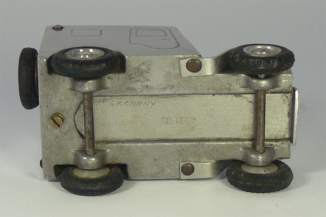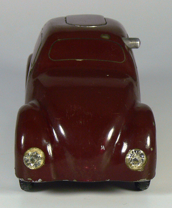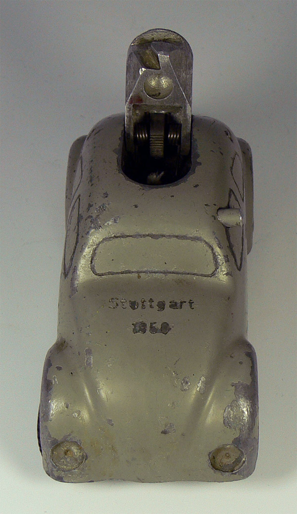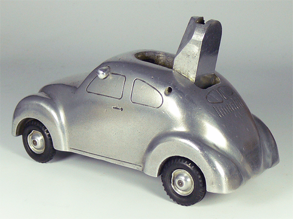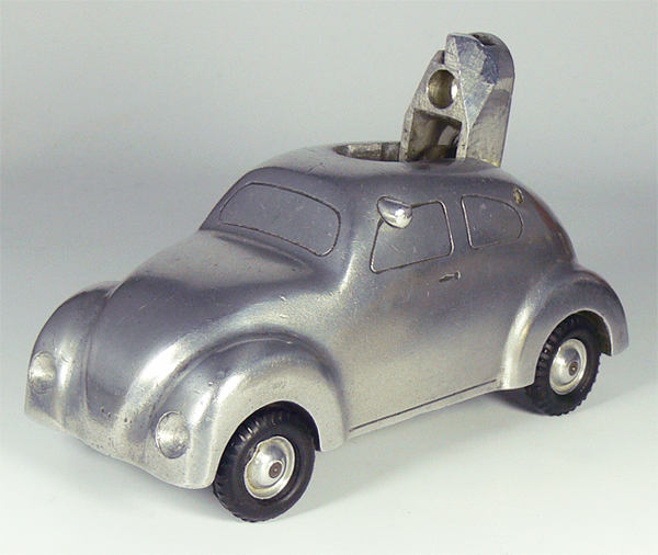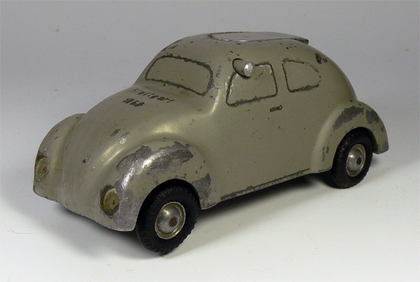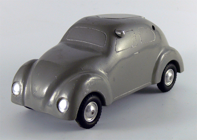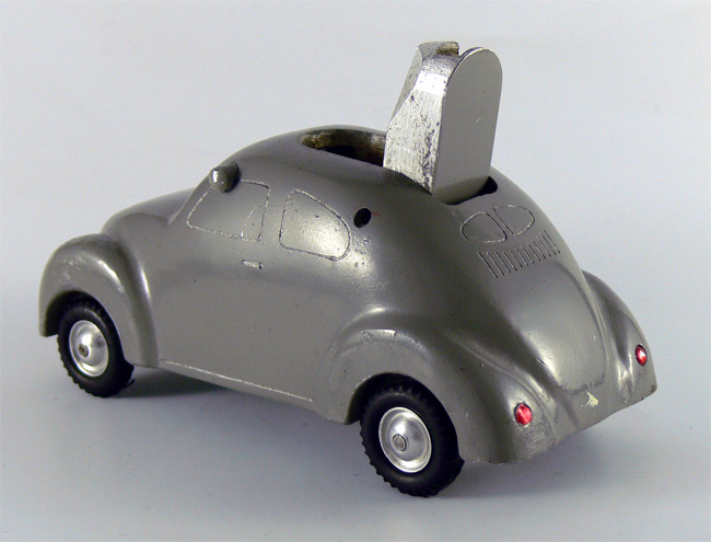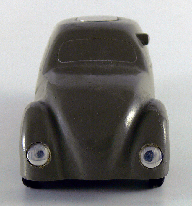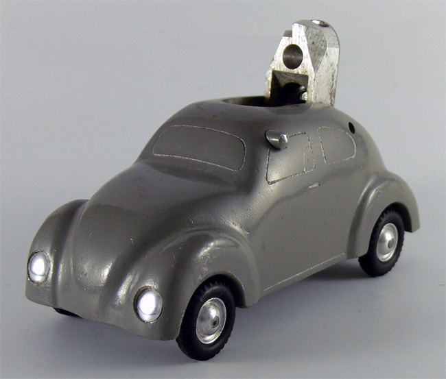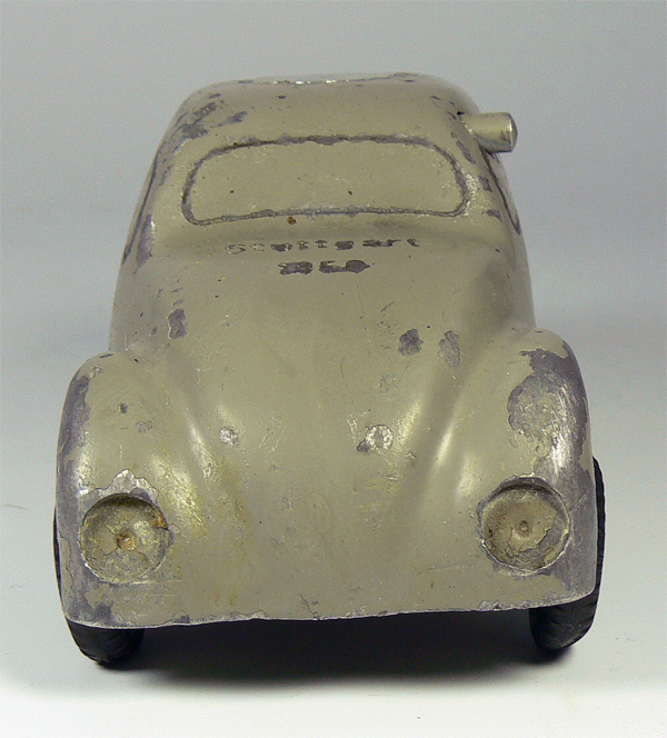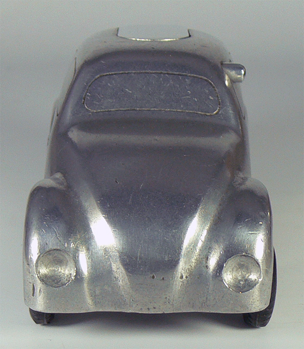 Dieses Modell ist eine Besonderheit, da es nicht lackiert ist (Original!), keine Lichteinsätze und auch keine Bohrungen für die Rücklichter besitzt. Die Bohrungen für die Frontscheinwerfer sind nach innen Rund - siehe nächsten Käfer dort sind die Bohrungen flach.