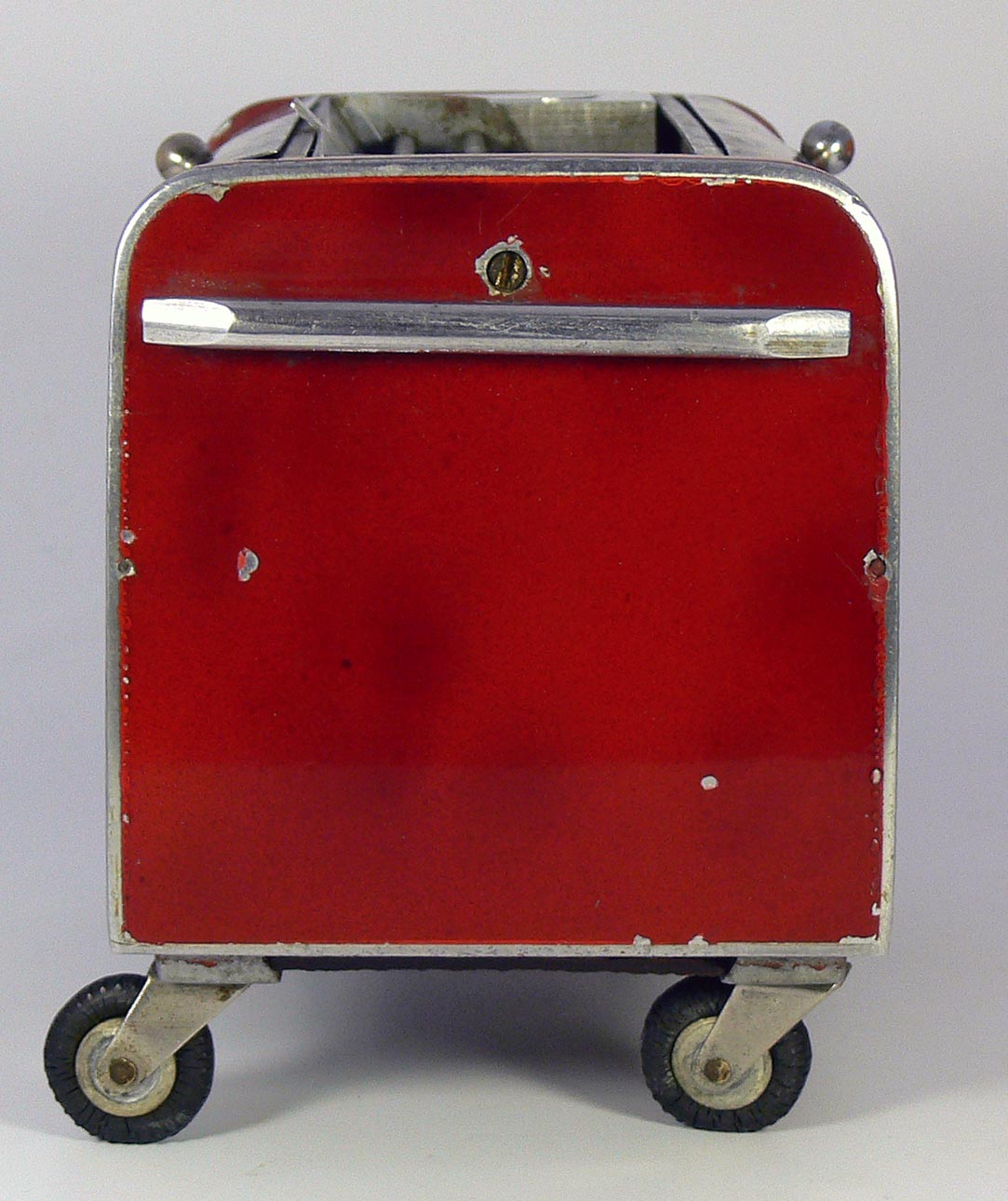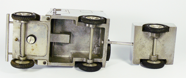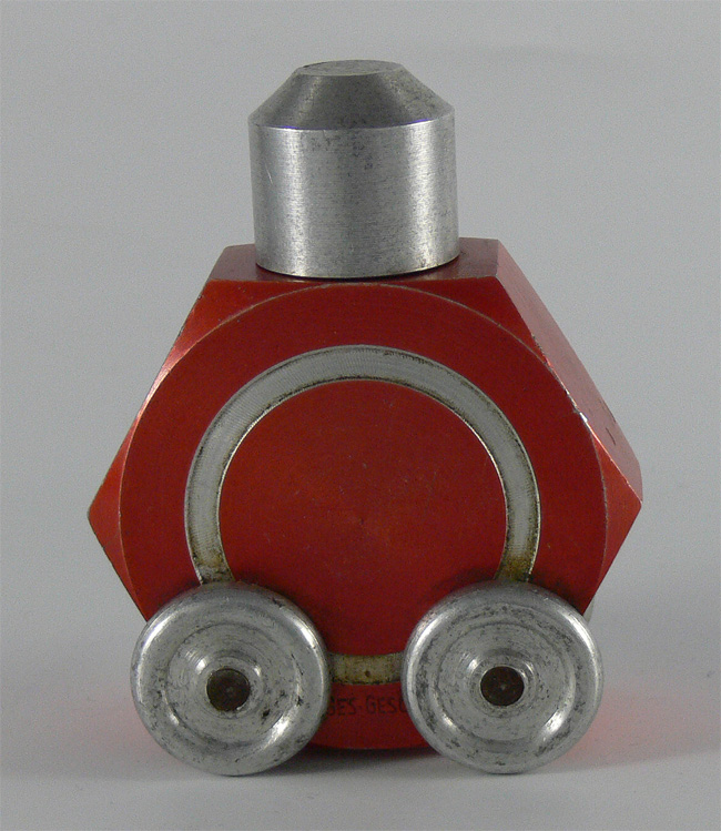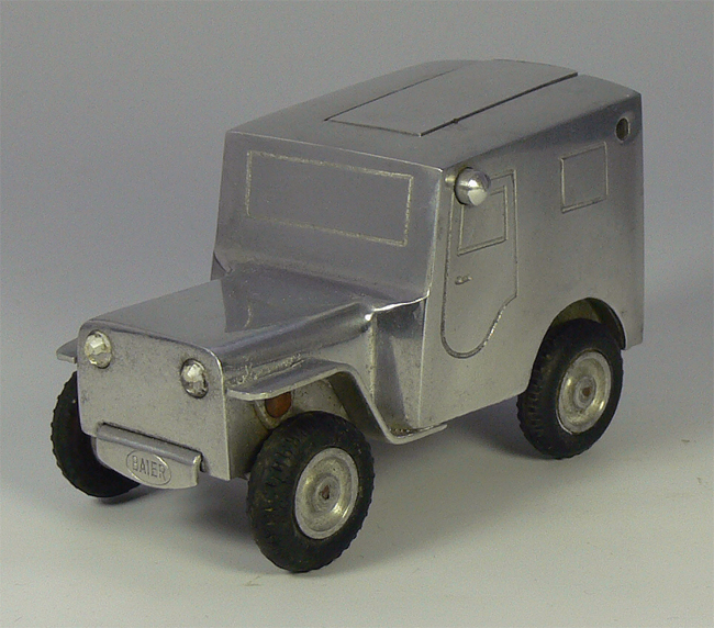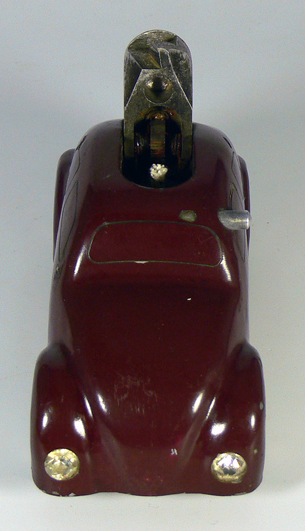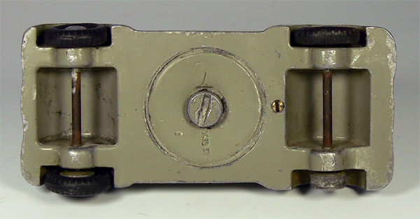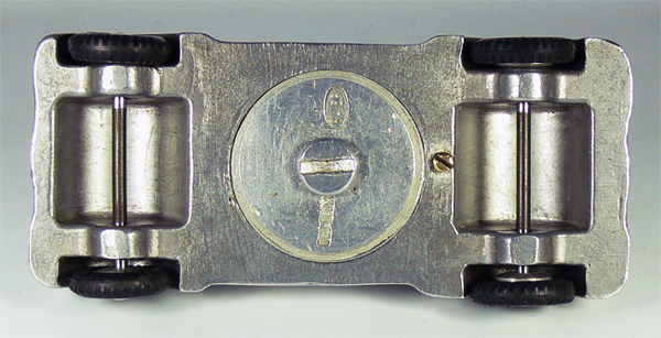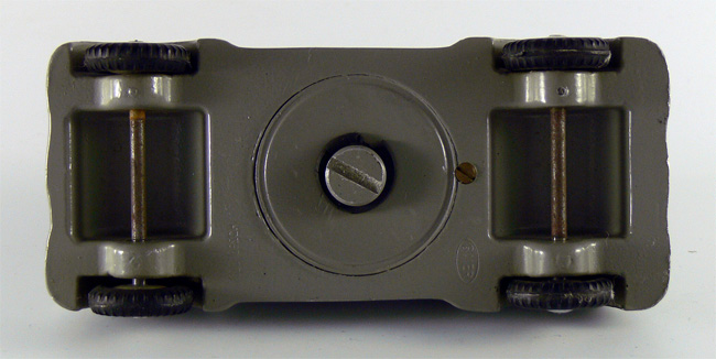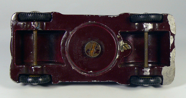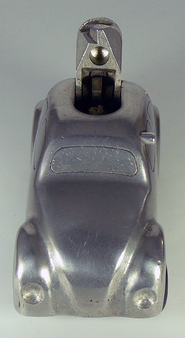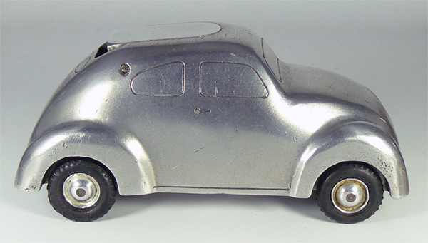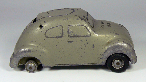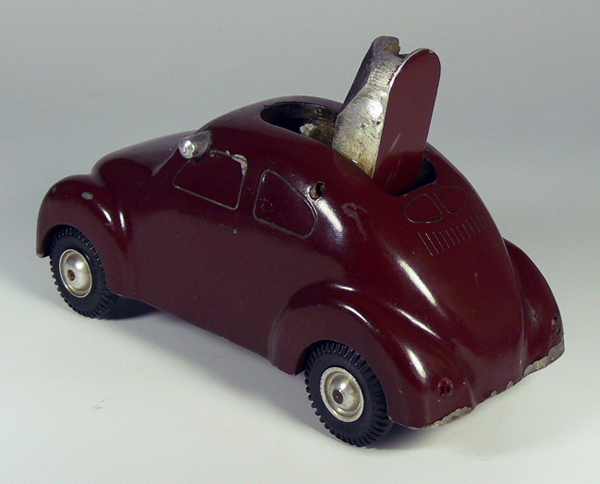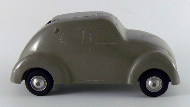 Dieses Modell ist eine Besonderheit, da es nicht lackiert ist (Original!), keine Lichteinsätze und auch keine Bohrungen für die Rücklichter besitzt. Die Bohrungen für die Frontscheinwerfer sind nach innen Rund - siehe nächsten Käfer dort sind die Bohrungen flach.