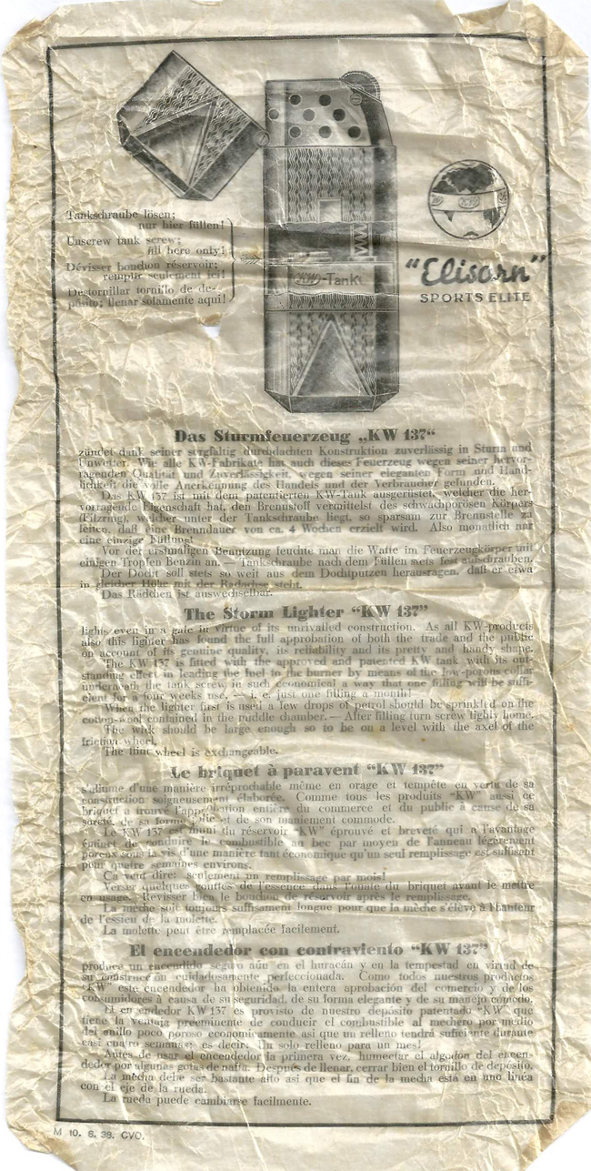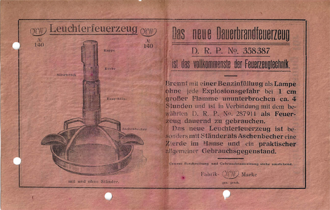 In Leipzig wird das erste Gasfeuerzeug des 20. Jahrhunderts vorgestellt, entwickelt von der Firma Karl Wieden. Im Messekatalog 1939 wird etwas verschlüsselt auf das Stück mit der bewährten Gelenkmechanik hingewiesen. Interne Aufzeichnungen belegen, dass bereits Anfang 1936 bei Karl Wieden an dem Projekt gearbeitet wurde. Der 2. Weltkrieg stoppte eine Serienreifmachung.