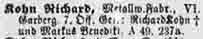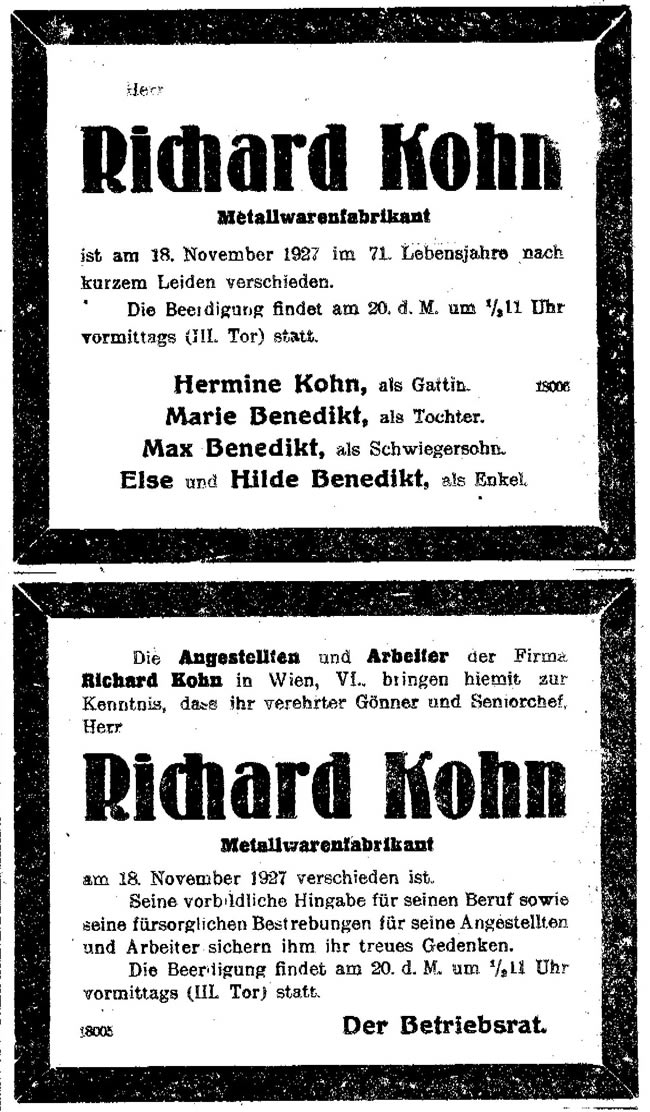 1942: Firma Richard Kohn wird im Wiener Branchenbuch nicht mehr genannt. Auch Markus Benedikt ist im Wiener Branchenbuch/ Einwohner nicht mehr zu finden.