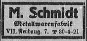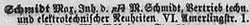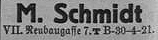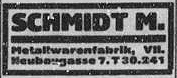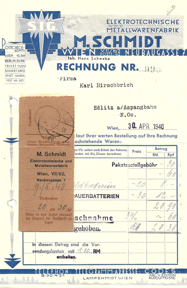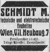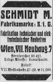 1913: Gründung der Firma M.Schmidt Vertrieb technischer und elektrotechnischer Neuheiten in der Amerlingstr. 1 in Wien VI.